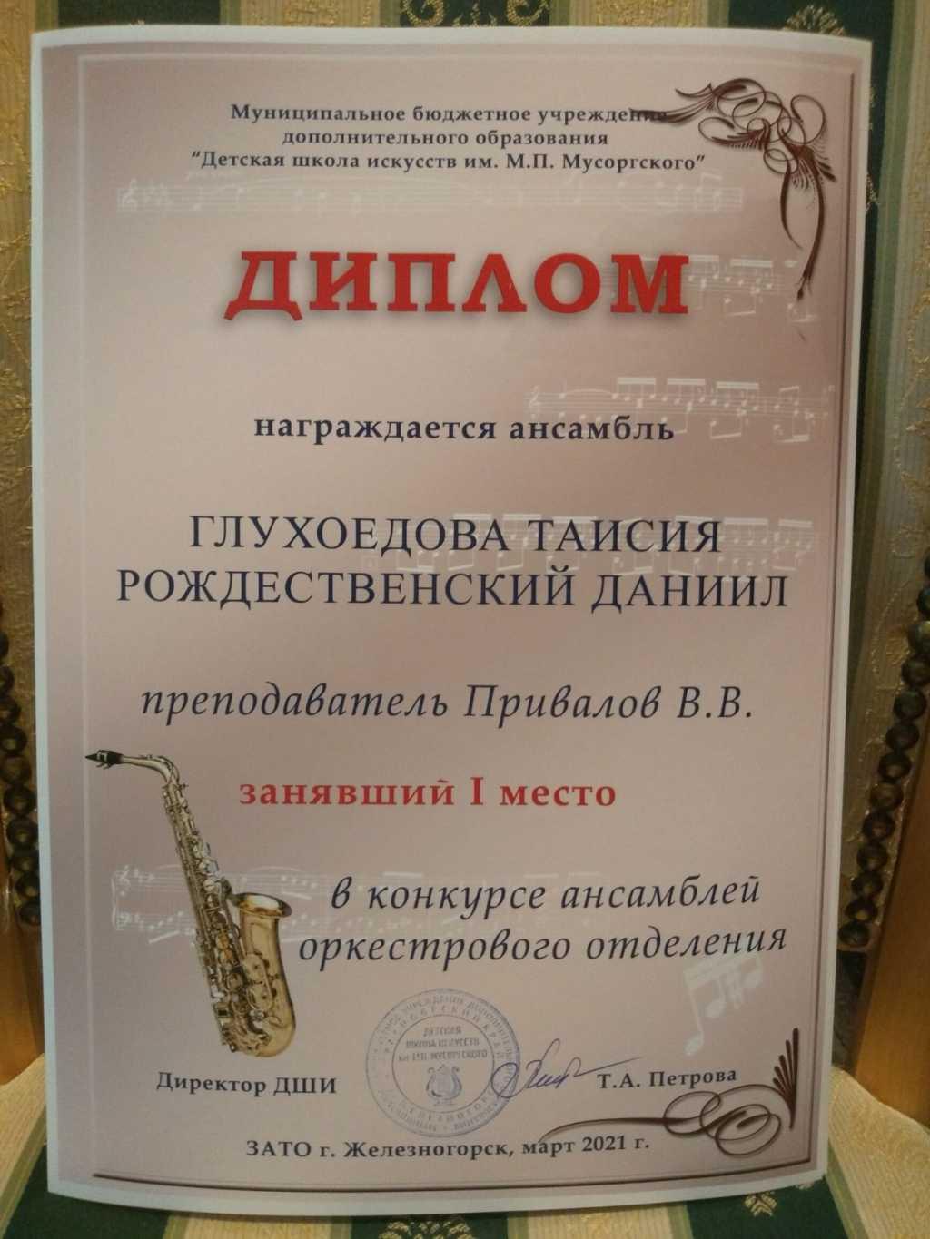 В конкурсе ансамблей оркестрового отделения ДШИ им.Мусоргского 1 место заняли Таисия Глухоедова (4 «А») и Даниил Рождественский (4 «М»), у Арсения Базанова (3 «Л») 2 место.