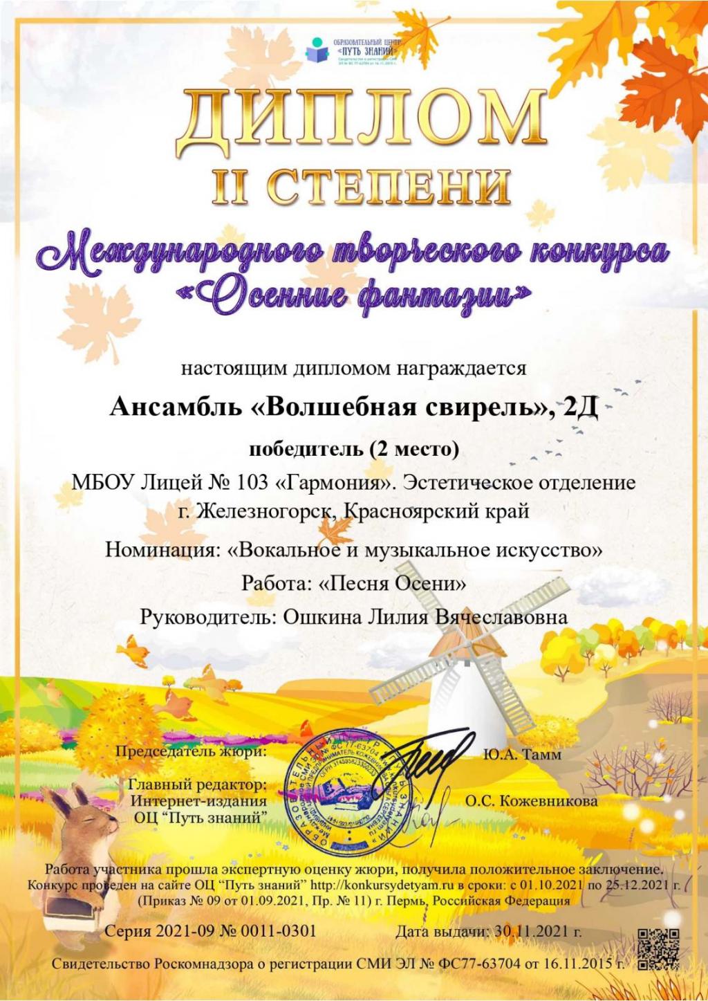 - Ансамбль «Волшебная свирель» 2 «Д» - Диплом II степени - Вокальное и музыкальное искусство (Рук. Ошкина Л.В.)