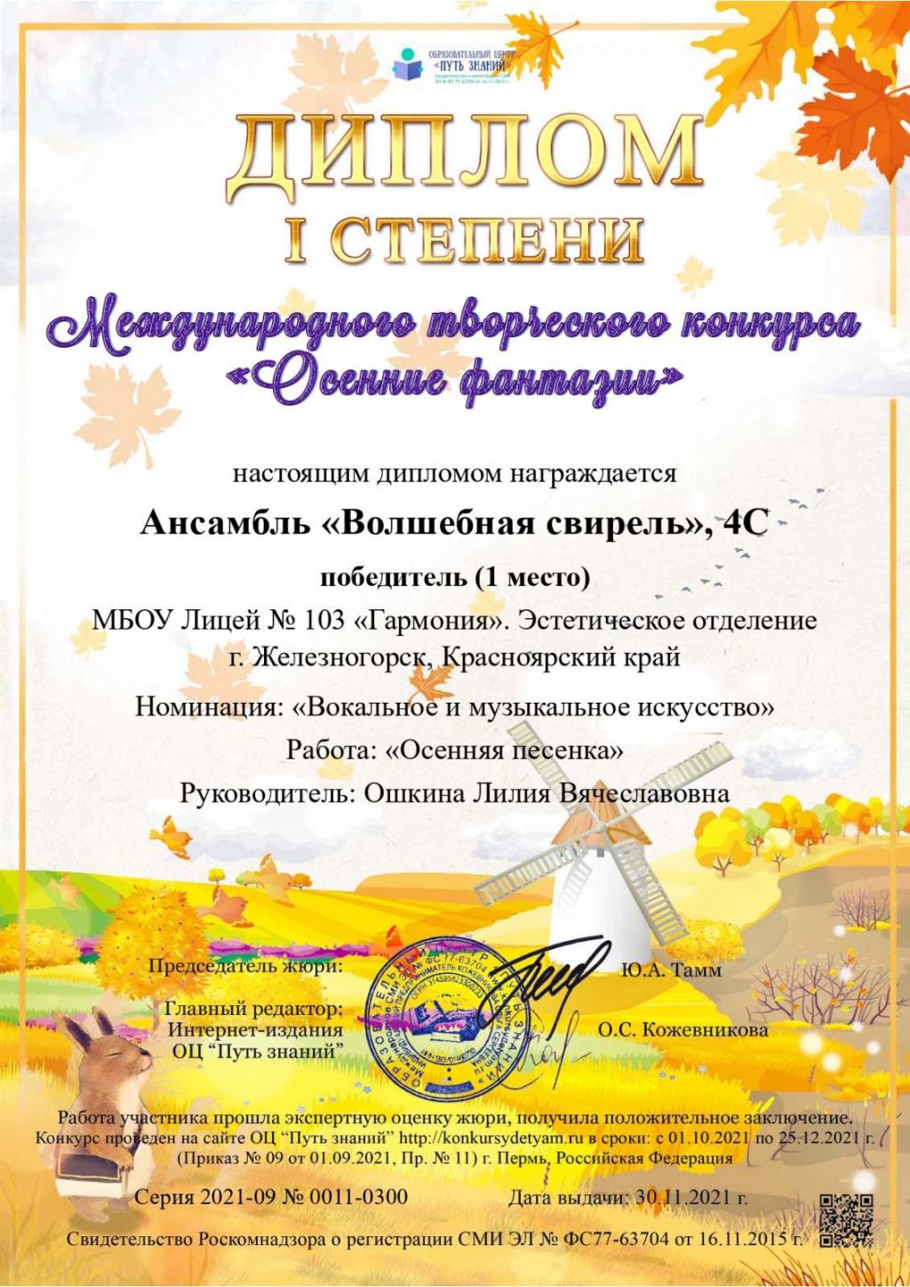 - Ансамбль «Волшебная свирель» 4 «С» - Диплом I степени - Вокальное и музыкальное искусство (Рук. Ошкина Л.В.)
