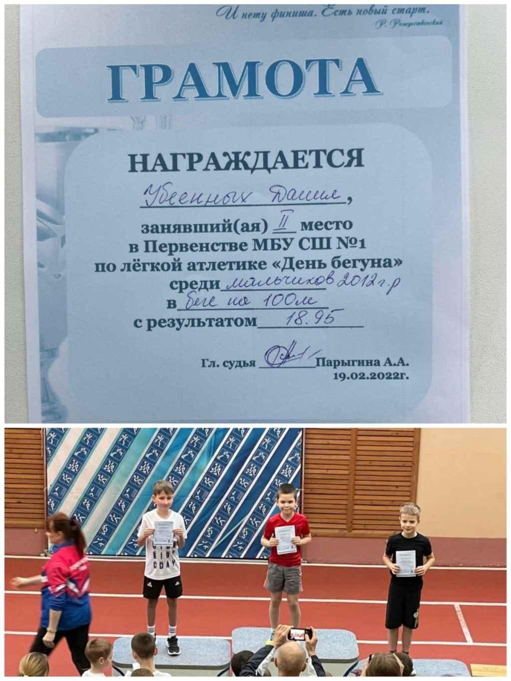 - 19 февраля в городе Железногорске состоялось Первенство Спортивной школы №1 по лёгкой атлетике "День бегуна". Даниил Убиенных 3 "М" класс (2012 г.р) бег на 100м - II место; Захар Рахманов 4 "С" класс (2011 г.р.) бег на 100м - I место, бег на 30м с барьерами - I место; Алиса Ведерникова 4 "Л" класс (2011 г. р.) бег на 30м с барьерами - I место, бег на 100м - I место; Милана Манохина 4 "Л" класс (2011 г. р.) бег на 30м с барьерами - II место, бег на 100м - II место; Ксения Нажалова 4 "А" класс (2011 г.р.) бег на 100м - III место.