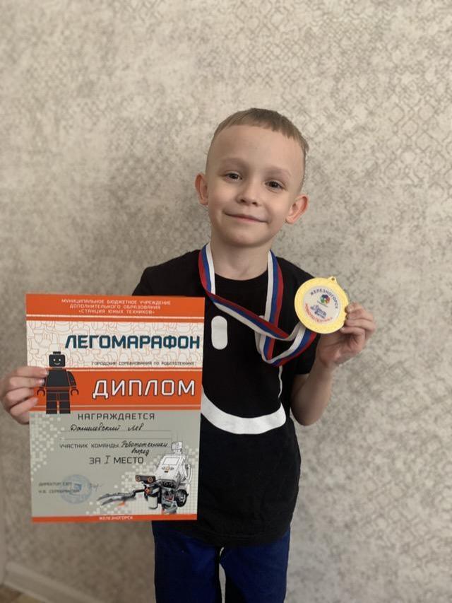 1. Ученик Лев Данилевский 1 "С" класс участвовал в городском легомарафоне с командой "Робототехники, вперед!" и занял I место!