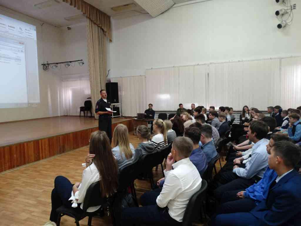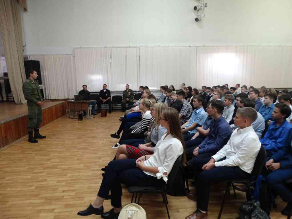 О проблемах терроризма с ребятами разговаривали представители в/ч 2669: капитан войск национальной гвардии Андрей Валерьевич Козлов и участник войны в Чечне прапорщик Александр Васильевич Ермаков. О юридической ответственности за терроризм с лицеистами общался капитан полиции Сергей Вячеславович Куст.
