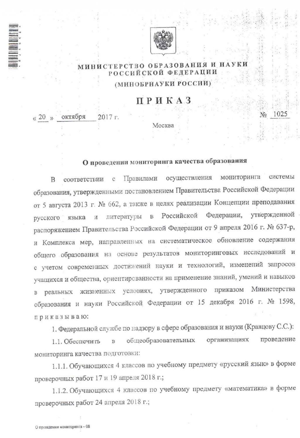 Приказ Минобрнауки №1025 от 20.10.2017