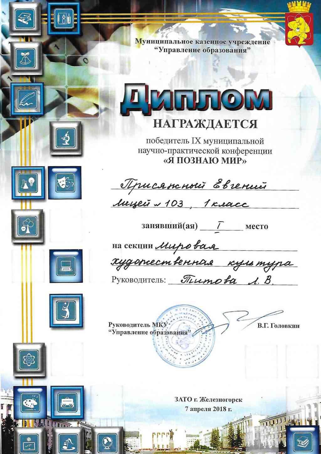 • В МБУДО «Дворец творчества  детей и молодёжи»  Присяжный Евгений  в секции «Мировая художественная культура» представил исследовательскую работу «Имя в жизни человека» (руководитель: Титова Л.В.). Данная работа  была отмечена дипломом I степени.