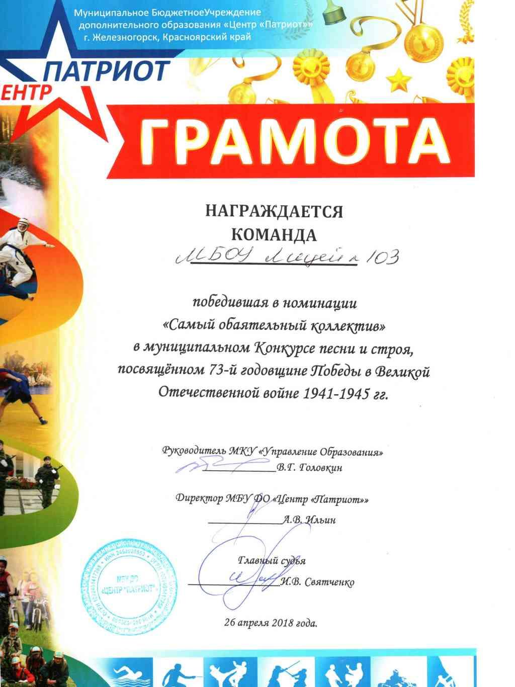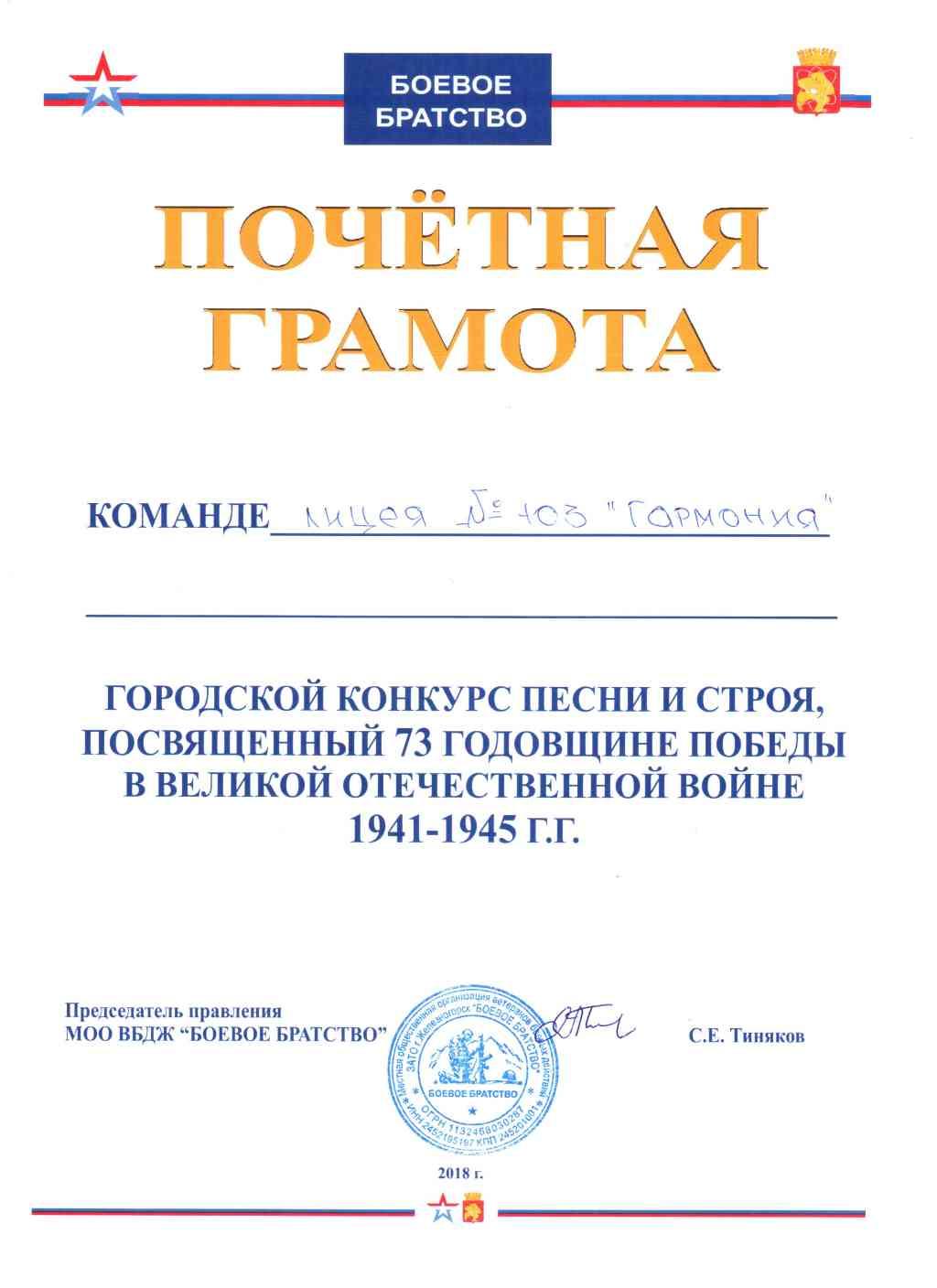 По мнению МОО ВБДЖ «БОЕВОЕ БРАТСТВО» команда Лицея вошла в тройку лучших, также ученицы класса стали победителями в номинации «Самый обаятельный коллектив».