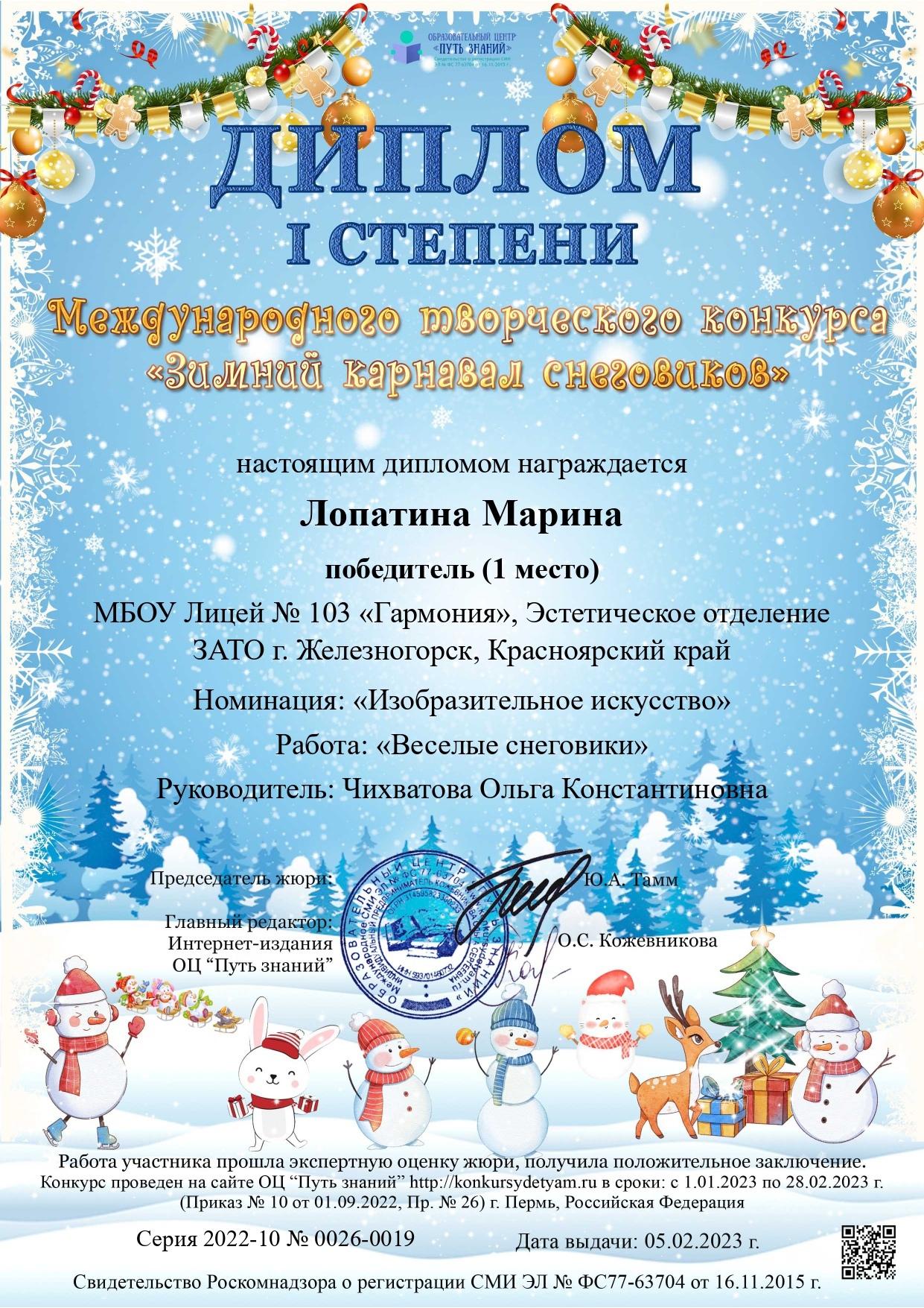 2. Наши ученики приняли участие в Международных творческих конкурсах «Зимний карнавал снеговиков» и «Дивные животные нашей планеты» и заняли призовые места! Руководитель Чихватова Ольга Константиновна.