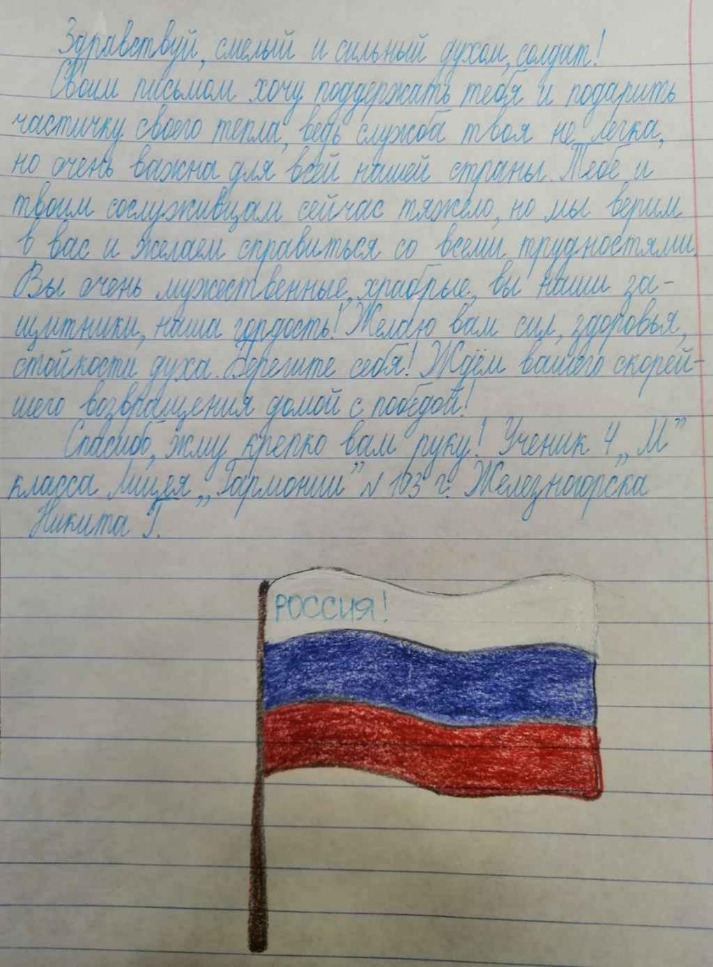 Также учащиеся 4 «М» класса Артем Аксёнов, Максим Дятлов, Никита Гайголос и Роман Синицин написали «Письмо солдату» и передали их для участников военных действий.