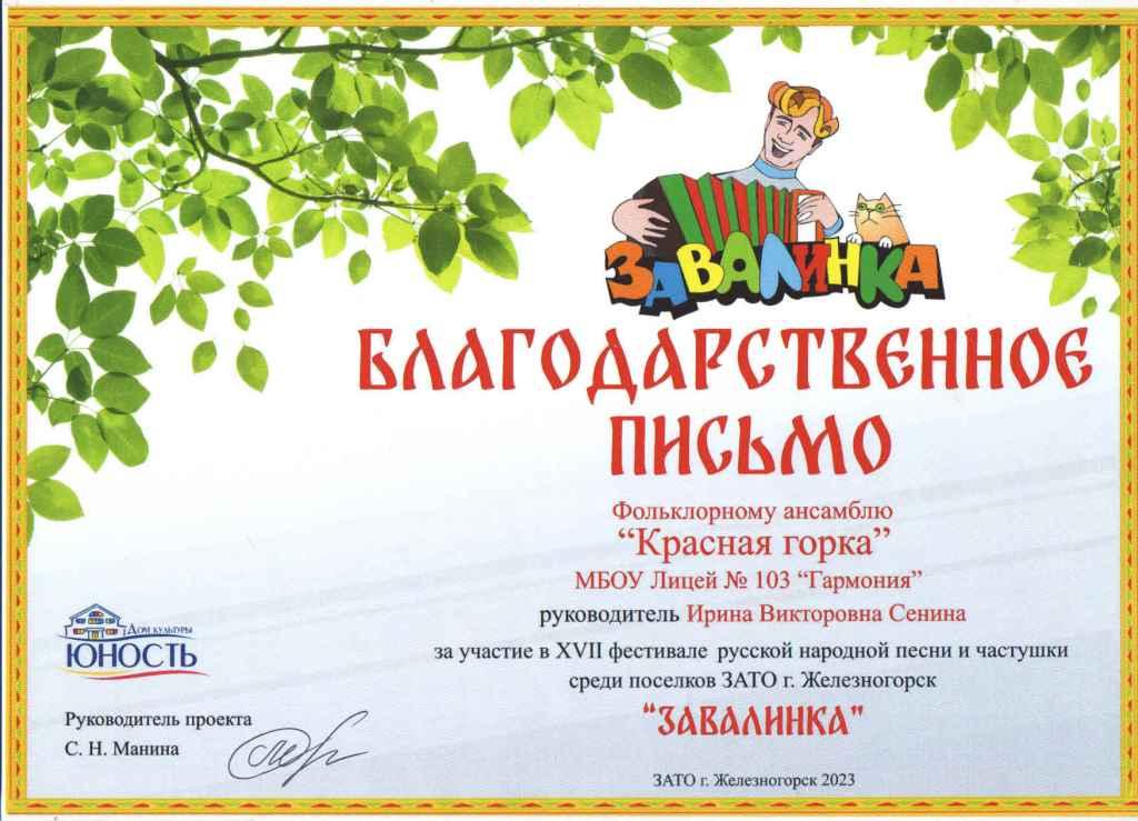 19 мая в Лицее №103 прошёл отчетный концерт для родителей фольклорного ансамбля «Красная горка», а 20 мая ребята вместе с руководителем коллектива Сениной Ириной Викторовной приняли участие в XVII фестивале русской народной песни и частушки, проходившем во Дворце Культуры Юность.