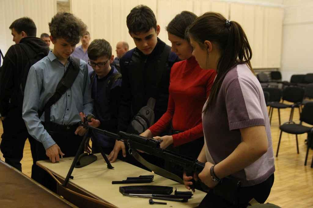 В самом конце ребятам показали несколько самых настоящих оружий разных видов. Там были винтовки, пистолеты, гранаты, а также различные снаряжения. Ребята моментально поднялись со своих мест, чтобы подойти и рассмотреть оружия. Гости подробно рассказывали про каждый экземпляр и отвечали на вопросы ребят.