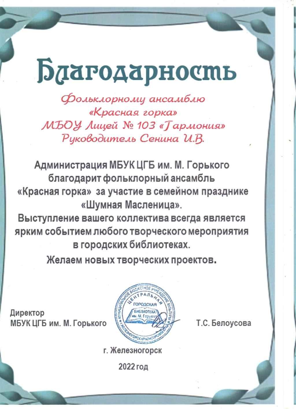 5 марта ансамбль «Красная горка» выступил в городской библиотеке им. Солнцева с песенно-игровой программой «Широкая Масленица», а 6 марта принял участие в городском празднике в парке «Гуляй, народ! Масленица у ворот!».