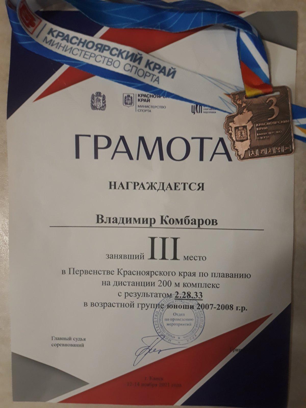 • Владимир Комбаров (6 "Л" класс, Чурина Е.О.) ездил на соревнования по плаванию в город Сосновоборск и занял I место! Также Владимир участвовал в Первенстве Красноярского края по плаванию в Канске и занял I и III место на дистанции 200 метров, I место 50м баттерфляй;