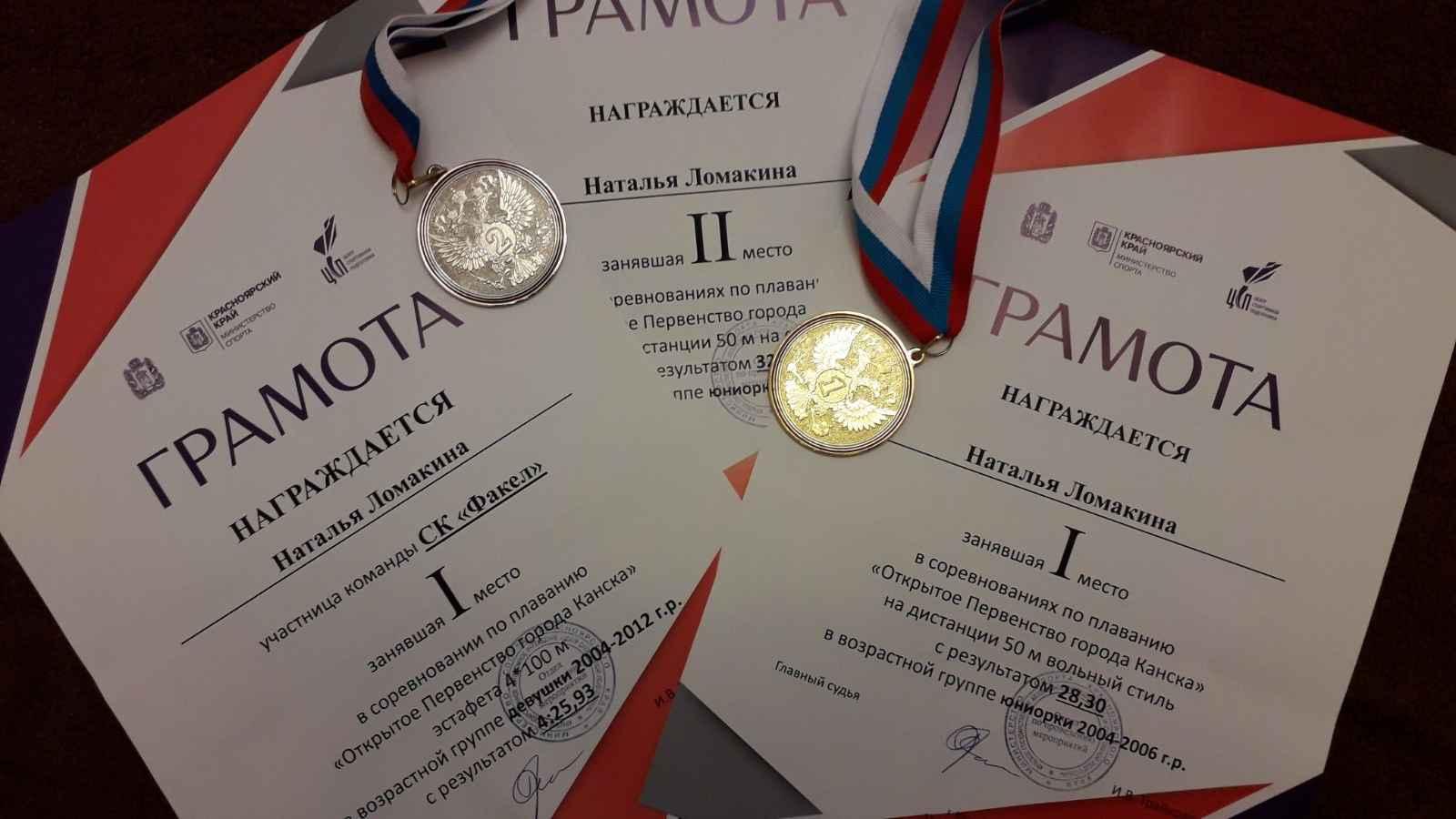 • Наталья Ломакина (10 "А", Сахно Н.Б.) приняла участие в соревнованиях по плаванию "Открытое Первенство города Канска". На дистанции 50 метров Наташа заняла I (вольный стиль) и II (на спине) место. В составе команды "Факел" - I место эстафета 4×100м женщины;