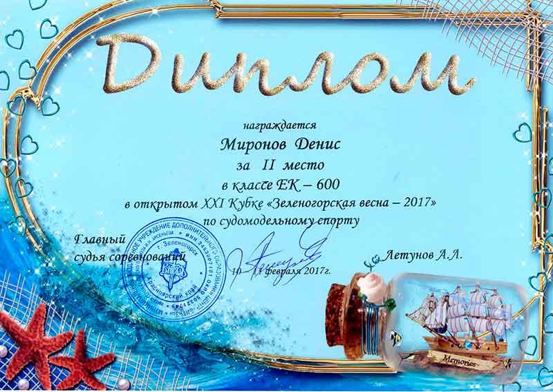 Младший брат Миронов Денис - ученик 2 «М» класса в открытом XXI Кубке «Зеленогорская весна - 2017» по судомодельному спорту занял I место в классе EX-600.