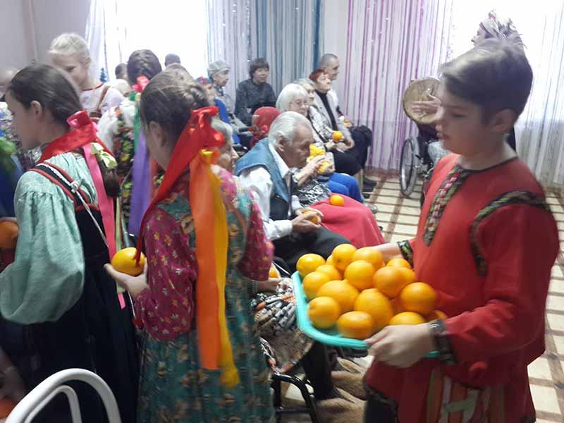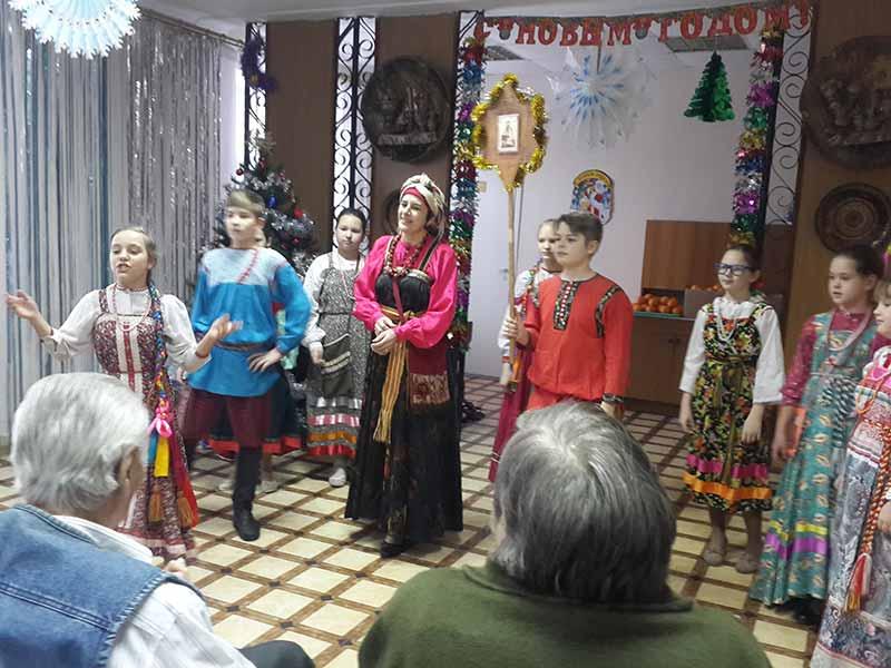 • 28 декабря в доме престарелых прошли предновогодние колядки, которые провели участники фольклорной группы Лицея 103 «Красная горка». Ярко, празднично, интересно были разыграны народные традиции, показана история богородицы, младенца Христа и царя Ирода. В заключении каждому зрителю дети подарили кусочек солнца в виде апельсина.