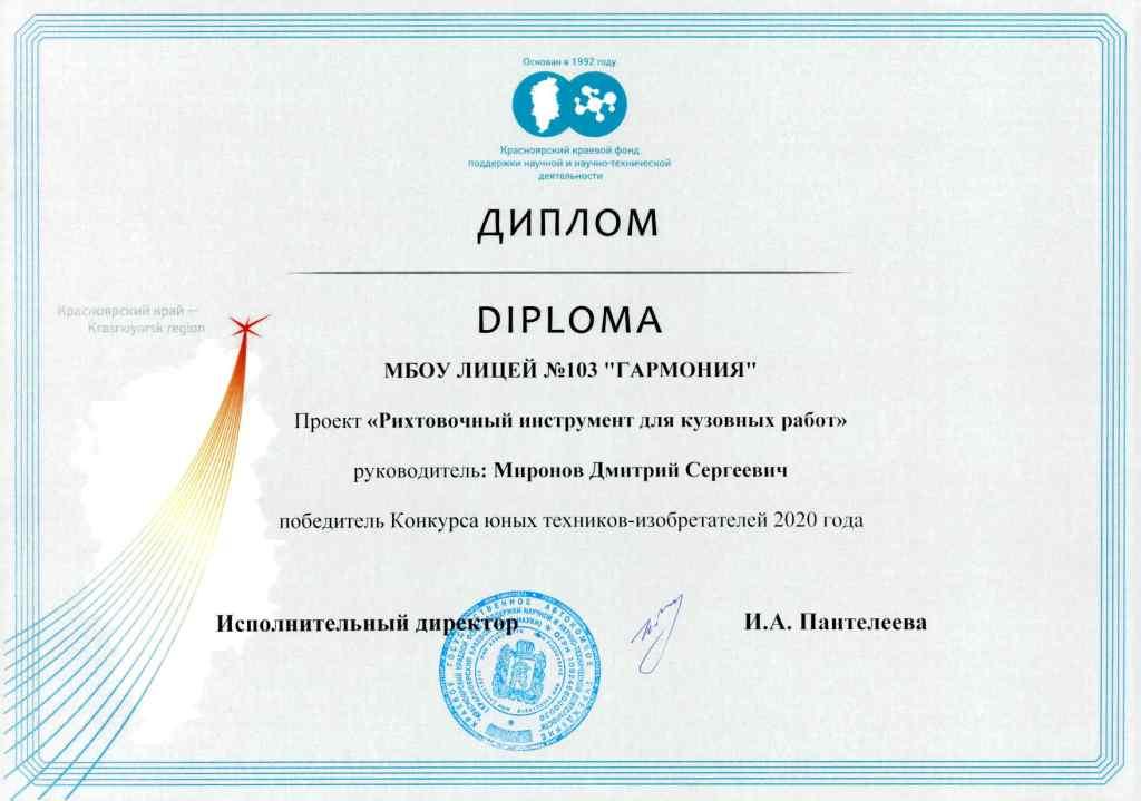 По результатам экспертизы научных отчетов и защиты работ, Миронов Дмитрий признан победителем конкурса юных техников-изобретателей.   Дмитрий разрабатывал проект совместно с Денисом Мироновым, который также является победителем данного конкурса.