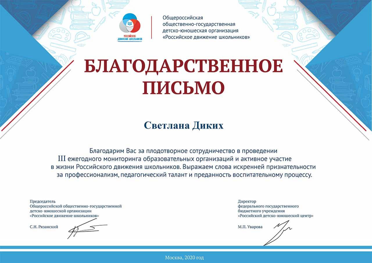 Более 570 школ приняли участие в III ежегодном мониторинге образовательных организаций, в которых ведётся активная деятельность Российского движения школьников. Общероссийское отделение РДШ выразило благодарность непосредственно Лицею №103 «Гармония» за содействие и преданность воспитательному процессу, а так же куратору РДШ в Лицее - Диких Светлане Алексеевне за профессионализм и педагогический талант.